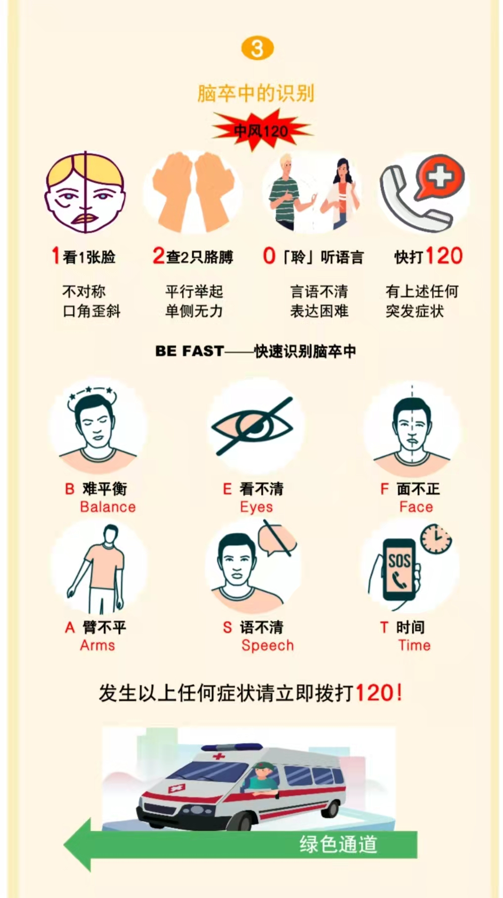 2021 年 7 月,中国卒中学会在第七次学术年会期间正式发布了识别卒中早期症状的「BE FAST 口诀 」,前 5 个字母各代表一个早期症状,最后 1 个字母是提醒一旦发现卒中症状,就要马上拨打急救电话,立刻就医: