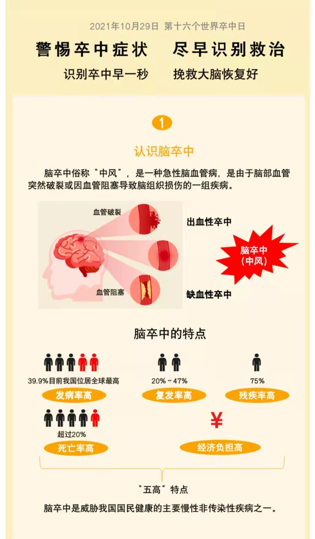 卒中(俗称「中风」)具有发病率高、致残率高、死亡率高和复发率高的「四高」特点,发病急、病情进展迅速、后果严重,为患者家庭带来巨大的经济损失和身心痛苦。发生卒中后,每分钟大约有190万个脑细胞死亡,脑组织及其所支配的运动、语言、认知及情感等多个功能也将同步逐渐丧失,但是,如果卒中症状能够被早期识别,患者在发病4.5小时之内被及时送医,得到规范的治疗,多数可以明显恢复,健康良好的生活质量也将得到挽救。因此,及时发现卒中的早期症状极其重要,越早发现,越早诊治,治疗和康复效果也就越好。