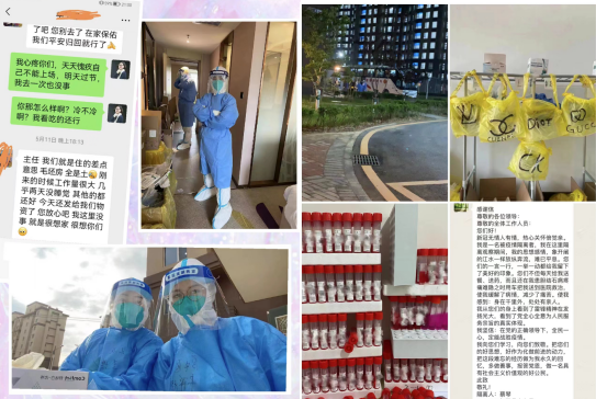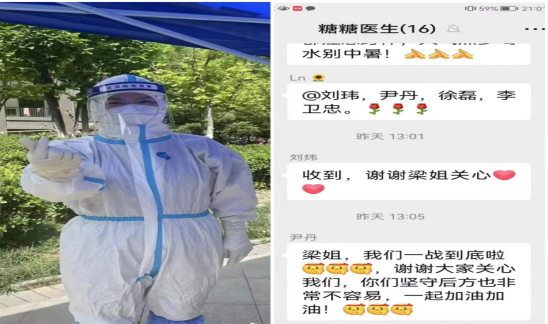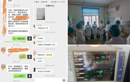 很多小区封闭,同事们有家不能回,他们心甘情愿,抛弃小家的幸福守护,投身在抗疫一线,心里充满了对医院的感激和对工作的激情,这是她们的留言:“主任,我到医院了,挺好的,铺盖都是新的。谢谢主任给我找的车”“主任,我和张媛住的小区也不行了,现在是还让出,我晚上夜班,张媛现在在家,您看能让医院派个车把张媛接出来么?不然明天就出不来了”多么朴实的想法,就是为了坚守上班、坚持把大家庭的困难永远放在第一。