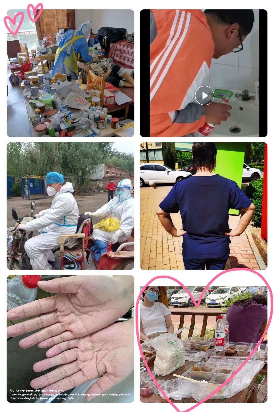 核酸采样点烈日当空,他们要穿着密不透风的防护服,汗水浸透衣衫。入户采样,很多都是中高风险地区,为了不耽误任务进度,大家配合默契,一鼓作气,顾不上喝水休息,连续奋战四五个小时。随身携带医疗垃圾袋、手消剂、采集管、信息登记机、采集管扫描机等各种采集用品,平地行走已经是大口喘气,再连续爬楼,经常出现心慌、憋闷、心跳加速等。他们有的腰痛难支,带上腰托继续奋战;有的手臂麻木、腿脚浮肿;有的大汗虚脱、中暑呕吐;脸上叠加的勒痕、泡的发白的手掌、湿了又干干了又湿的衣服早已都是常态。