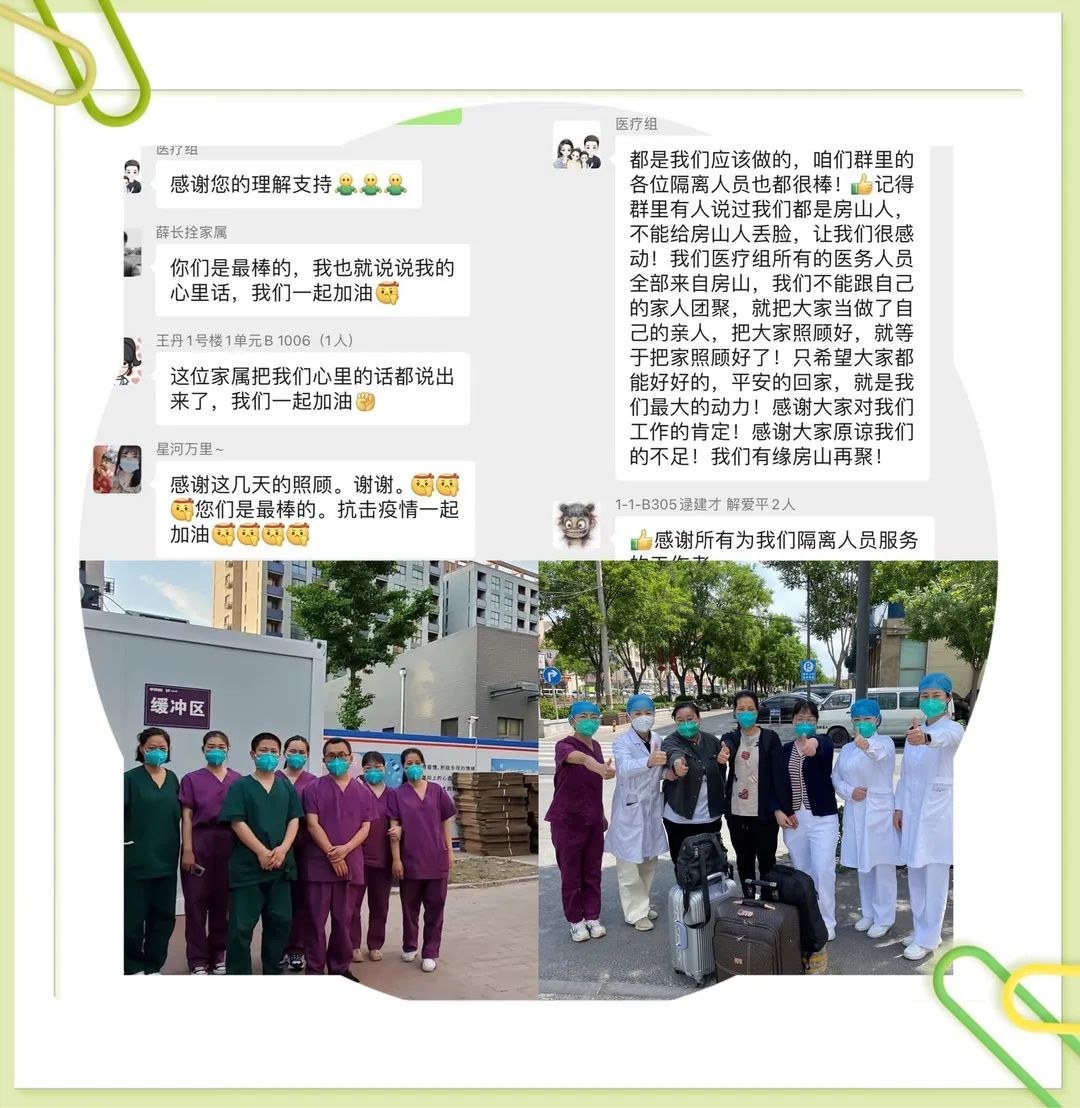 到达昌平隔离点后,工作任务繁重,有时需要身穿几套防护服作战,每天只能休息3、4个小时,可她们从不抱怨,映在心间的是医院领导的重托与战友的惜别,她们传回的消息永远是隔离点里啥都好,勿挂念,她们动情地告诉医院的同事,这里有领导的关怀慰问,有同事间的相互支持,有隔离家属的高度肯定,这里的太阳每天都是新的。