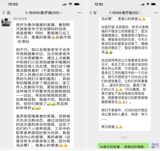 我们给隔离人员建立了微信群,帮助他们解决各种各样的问题,在观人员中,有一对老夫妻,老爷子做完脑血管手术不久(具体手术叙述不祥),既往患有冠心病,需要长时间服用一种安神药物,可是忙乱中忘记带在身上,我立即和本单位联系,第一时间解决了药物的问题,隔离观察期间,老人出现胸闷不适等症状,和红区医疗人员沟通,详细问询老人症状,并自费购买硝酸甘油等药物,持续监测病情变化,老人症状得到明显缓解,在隔期满时,优先安排转运,老人平安到家后,打电话感谢我们;还有一位女士,左上肢术后,入住第二天需要换药,经过积极协调,指派专科医生为其进行换药;还有房间内缺床单、被罩、卫生纸、有物品损坏,快递未能及时送达等等情况,都会找到我们解决,通过和相关部门联系,沟通,及时、高效的解决了各项问题,经过我们的辛苦工作,耐心解答各种疑问,隔离人员的家属给我们送上了感谢信,信中言辞恳切,充分肯定了我们的工作,那一刻,再多的辛苦都化为乌有,这是最大的欣慰。