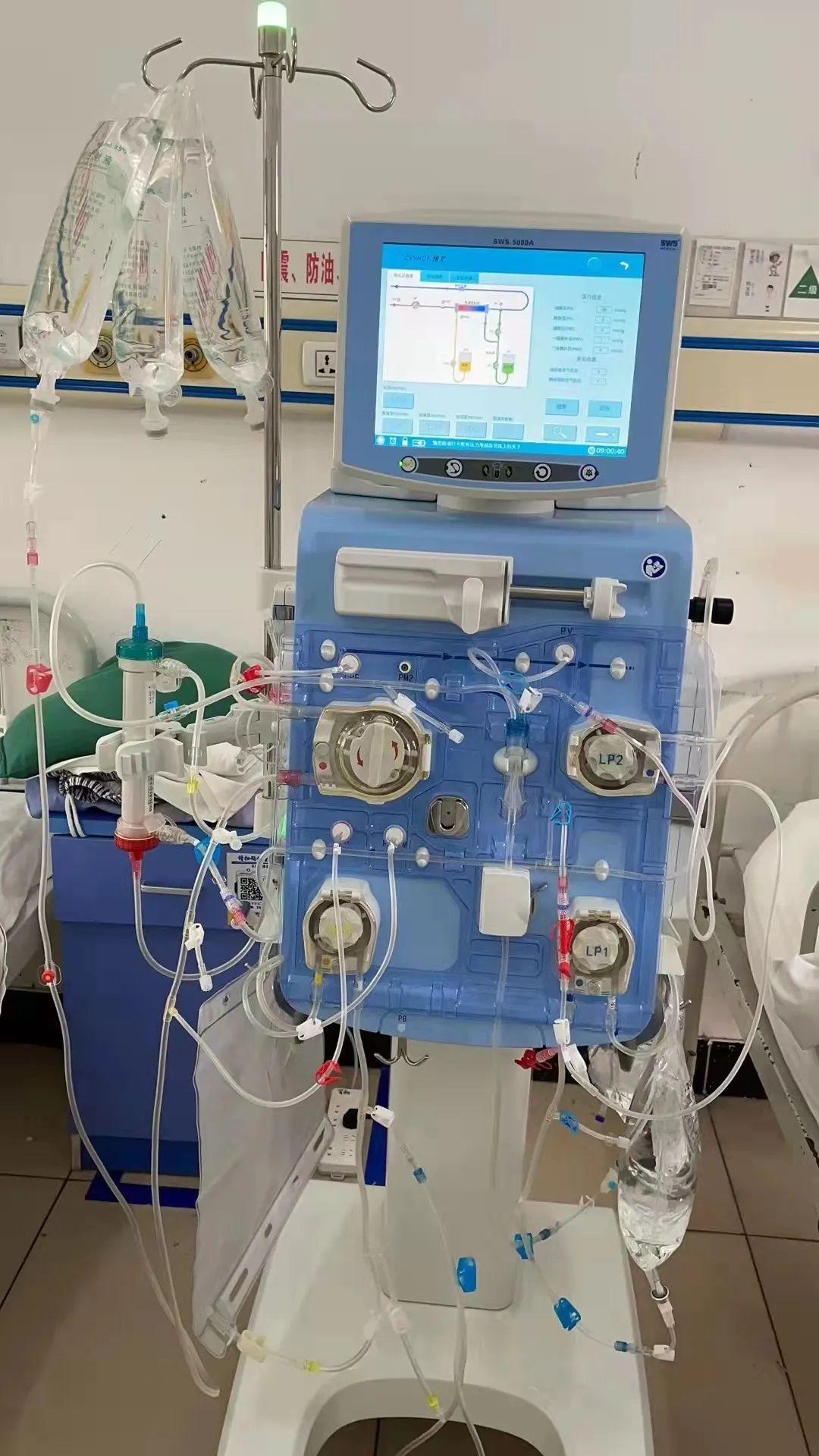 只看到护士姐姐娴熟的安装,仔细的预冲,充分的肝素浸泡,四十分钟的时间就完成我身上的准备工作。