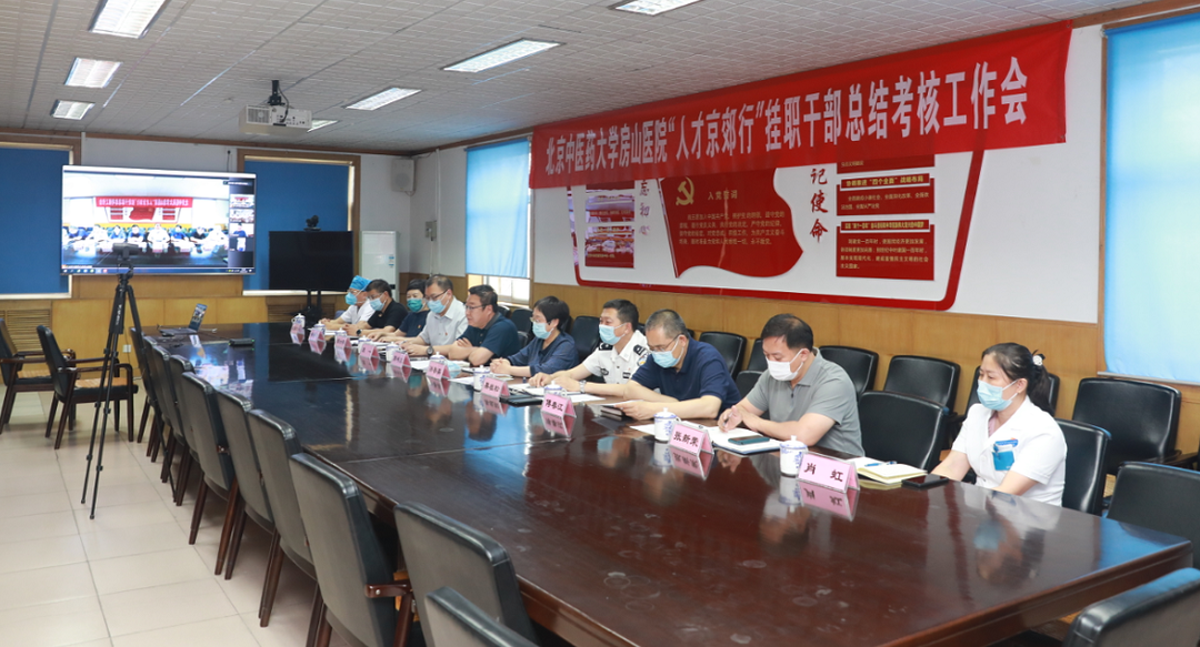 2022年6月22日下午,北京中医药大学房山医院召开第十三批“人才京郊行”挂职干部总结考核工作会,对2021年来医院挂职的副院长袁一同志一年以来的工作情况进行总结。东城区卫生健康委二级调研员张家惠、北京第六医院党委副书记、院长卢艳丽、区委组织部副部长赵磊、区委组织部人才科科长申奇锦、区委卫生健康工委党委副书记张文艳线上参加会议,医院领导班子成员以及相关科室主任等现场参加了会议,会议由党委书记郭书文主持。