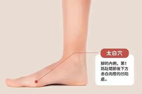 「太白穴」为脾经原穴,利用此穴可以补脾、升脾阳清气,对脾虚引起的食欲不振、腹胀、腹泻、水肿能起到很好的防治效果。脾气升清而胃气降浊,二者为中焦气机升降之枢机,故养脾之升的同时要养胃之降,配合艾灸「足三里穴」脾胃同调。