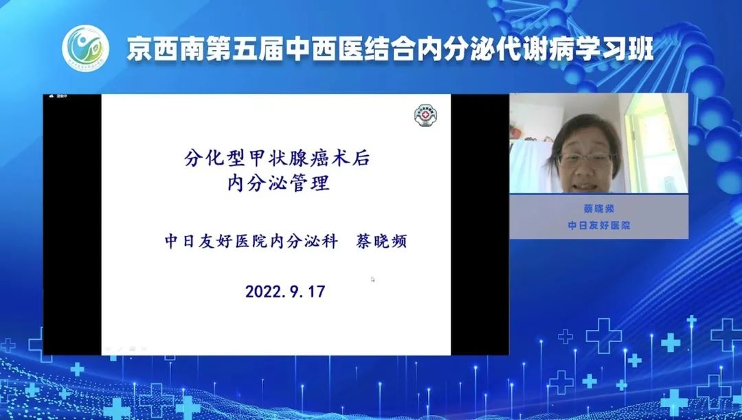 中华医学会内分泌学分会第十一届委员会甲状腺学组委员、北京市医学会内分泌学分会第九届委员、北京市医师协会甲状腺疾病专家委员会第一届委员、中日友好医院内分泌科蔡晓频教授讲授《甲状腺癌的术后内分泌管理》。