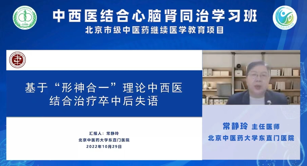 学习班邀请到了中国医学科学院阜外医院孙兴国教授、首都医科大学附属北京天坛医院张在强教授、北京中医药大学房山医院孙鲁英教授、北京中医药大学东直门医院林谦教授、北京中医药大学东直门医院时晶教授、中国中医科学院西苑医院刘美霞教授、北京中医药大学东直门医院常静玲教授、北京中医药大学第三附属医院罗斌教授等多名专家同台授课,分别就医学的未来—整体整合生理学医学指导心脑血管代谢慢病防治康养一体化整体管控、心脏疾病与神经疾病的临床病理关联、肾病综合征的中西医结合诊治、冠心病的中医药治疗优势、适用于中国人的血管性痴呆诊断框架和治疗规范、老年期痴呆的中西医结合诊治、基于“形神合一”理论针刺治疗卒中后失语、疏调气机治失眠等做了精彩的学术报告,授课内容丰富,实用性强。
