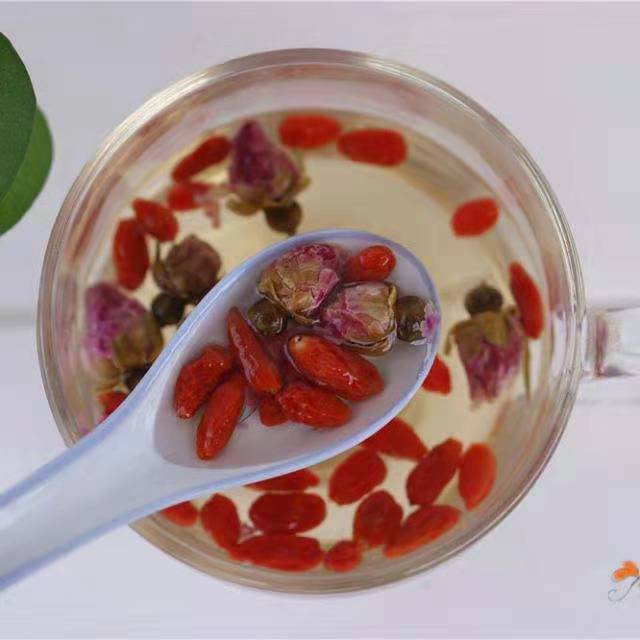 做法:将药材洗净,将枸杞、玫瑰花、生姜和红糖同时放入壶中,加水煮开,待温度适宜即可饮用。
