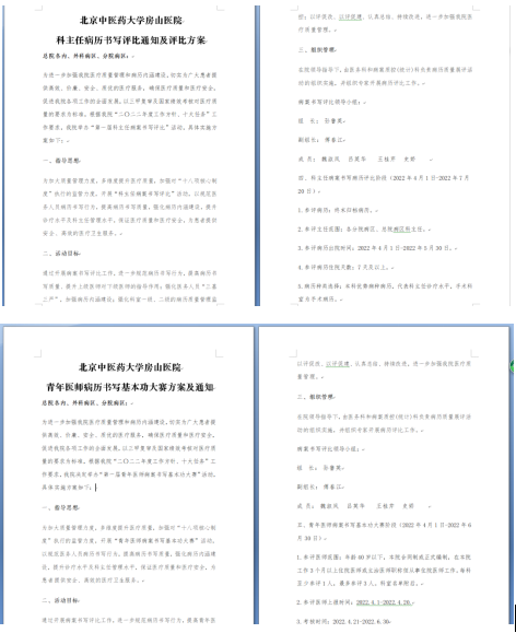 2022年是北京中医药大学房山医院高质量发展年,也是建院四十周年传承创新再起航的一年。为进一步加强医院医疗质量管理和病历内涵建设,切实为广大患者提供高效、价廉、安全、质优的医疗服务,确保医疗质量和医疗安全,促进各项工作的全面发展,以三甲复审及国家绩效考核对医疗质量的要求为标准,根据医院“二〇二二年度工作方针、十大任务”工作要求,举办“第一届科主任病案书写评比”及“第一届青年医师病案书写基本功大赛”活动。