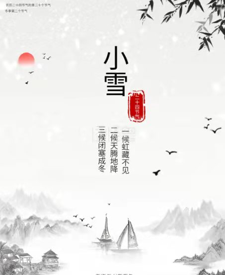 坤卦亥月, 太阳达到黄经240°,进入小雪节气。古籍《群芳谱》中说“小雪气寒而将雪矢,地寒未甚而雪未大也”,就是说小雪气温急骤下降,寒气逼人,阴盛阳衰,进入休养闭藏状态。《月令七十二候集群》曰:“十月中,雨下而为寒气所薄,故凝而为雪。小者未盛之辞”。