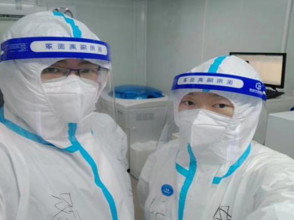 刘佳副主任技师来自北京中医药大学房山医院检验科,路春生主管检验技师来自房山区良乡医院。检验科最开始是两间空房子,经过两个人对感染防护的认识,提出门窗改造,增加排风扇,安装调试血常规、尿流式沉渣、生化仪器。患者的标本气溶胶感染风险极高,他们总是用勤消毒、憋气开帽等方法减少污染,做好检验工作。