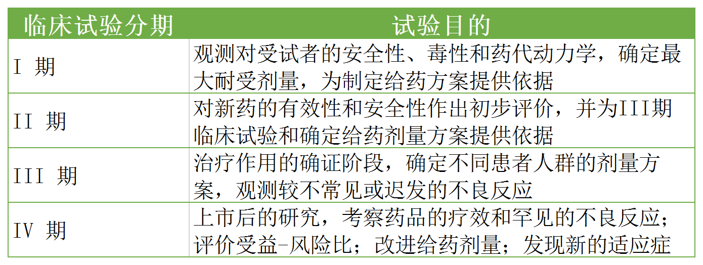 药品临床试验分为Ⅰ、Ⅱ、Ⅲ、Ⅳ期临床试验,每期临床试验的设计和目的不同。前三期为新药上市前必经阶段,第四期为药品上市后的监督性研究。
