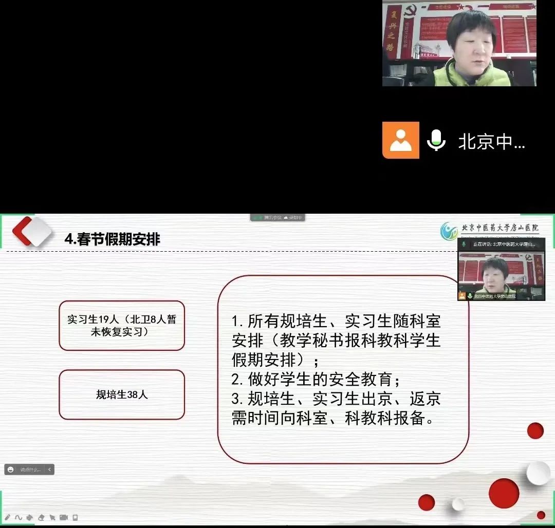 为进一步提高我院教育教学水平、加强教师职业道德培养,1月11日,北京中医药大学房山医院线上举办临床教师培训会,会议由教学主管院长张红主持,各教研室(组)主任、秘书、临床教师等142人参加了此次培训。
