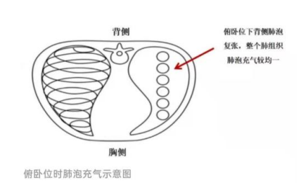 俯卧位通气法通过改变患者体位使塌陷的肺泡复张,改善肺重力依赖区的通气/血流比例,减少无效腔而增加功能残气量,改善膈肌运动方式和位置,利于分泌物的引流,进而改善氧合和廓清气道、减少呼吸机相关肺损伤的发生,减少患者因氧合障碍导致的继发多器官功能障碍和病死率。