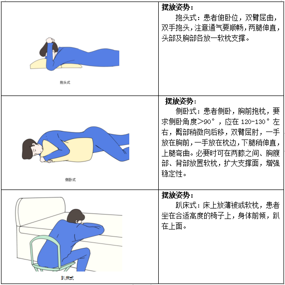俯卧位前应禁食1-2小时,且注意保护男性生殖器、女性胸部及各骨隆突处。治疗时间原则每天应大于12小时。如无法耐受,可间断进行:每2-3小时更换卧位或姿势一次,每日6-8小时,逐日递增至要求的治疗时间。