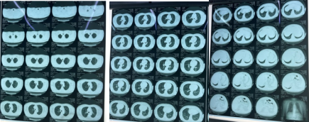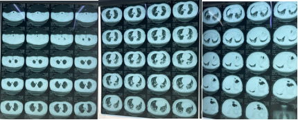 患者舌象:舌质转淡,这个属于邪气盛耗伤了阳气。复查肺CT以观察患者肺内炎症的变化。