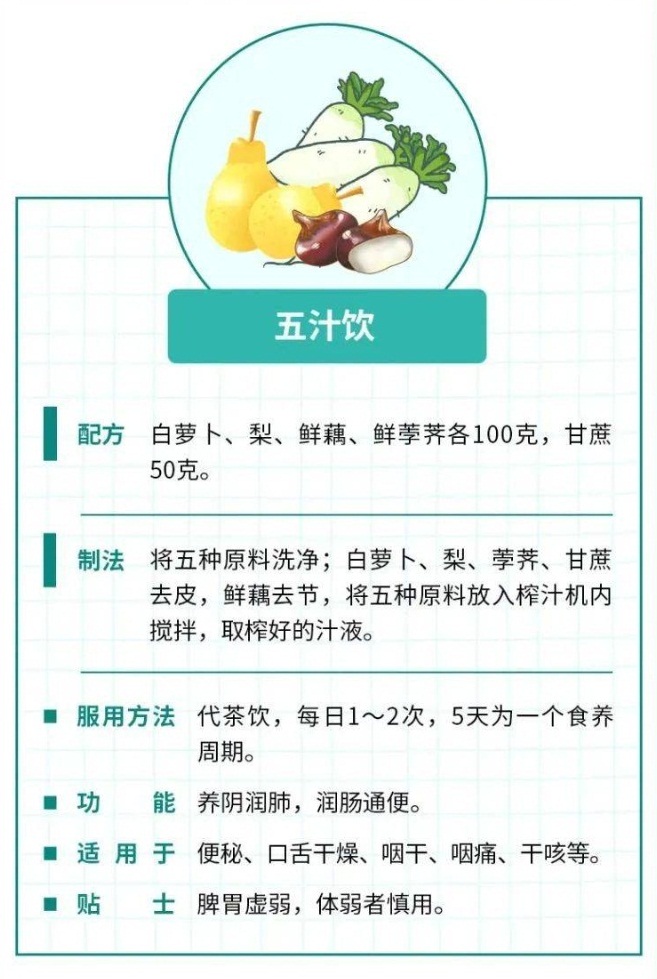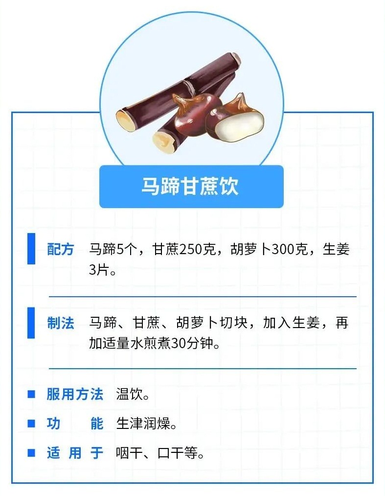 若存在口干,咽喉部干、痒、疼以及声音沙哑等问题,建议首先补充足够水分,全天少量多次进水;尽量保持声音正常,不要高声说话或喊叫。可以试试吸入蒸汽(用毛巾遮盖头部后从装开水的杯中吸入蒸汽)10-15分钟,以缓解干燥和滋润声道,同时建议停止吸烟,还可以根据自身情况选用以下茶饮: