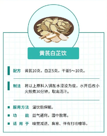 如果出现嗅觉减退、鼻塞,建议尝试进行嗅觉训练,包括每天闻柠檬、玫瑰、丁香或桉树,一天两次,每次20秒。若还有打喷嚏、怕冷等症状建议服用黄芪白芷饮;无以上外感症状者可食用养脾生津粥,具体做法如下。