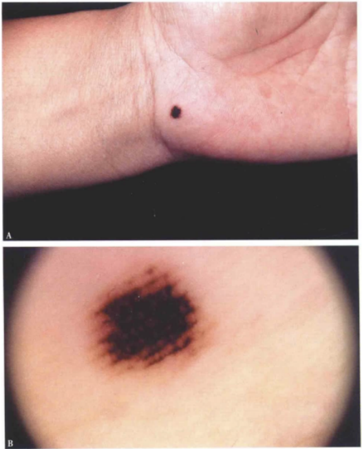 2.动态随访图像监测疑似恶性黑色素瘤皮损,必要时可行活检证实。