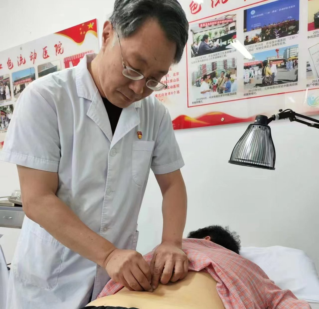 王良文主任为颈椎病、肩周炎患者诊治,针灸、按摩,额头上已经渗出了细密的汗珠。
